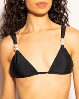 Le Haut de maillot Olivia noir incarne l’élégance minimaliste twistée par une touche précieuse. Sa forme triangle classique, rehaussée de perles nacrées sur les bretelles, apporte un raffinement discret et ultra féminin.