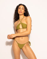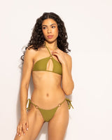 Le Bas de maillot Claudia vert offre une silhouette élégante grâce à sa coupe échancrée, idéale pour allonger visuellement la jambe. Les anneaux dorés placés de chaque côté apportent une touche chic et lumineuse au modèle.